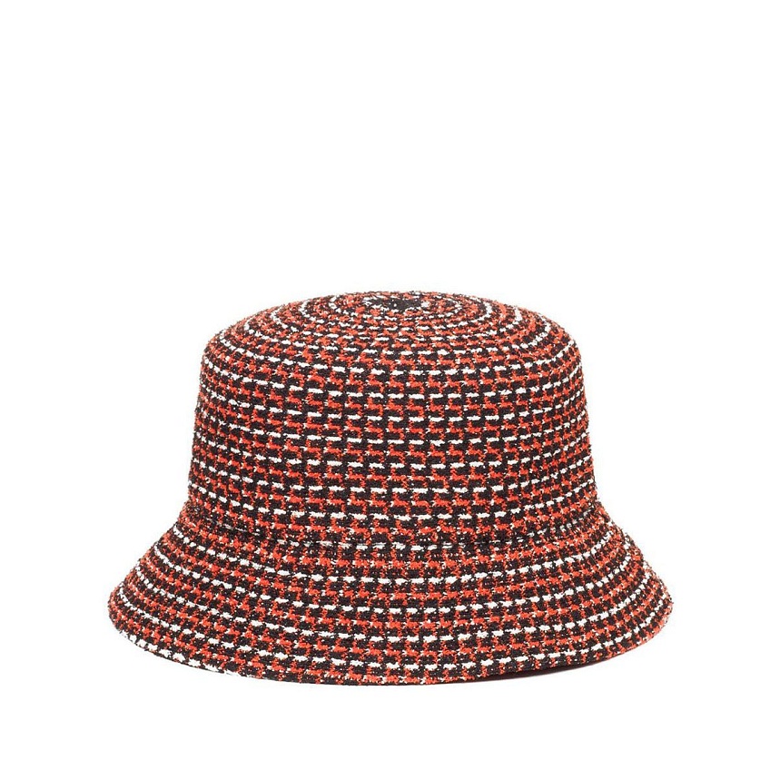 Плоская панама из плетёной бермуды. Силуэт, получивший название "бакет"(ведро), с характерным плоским верхом и полями средней длины. Жаккардовый узор выполнен в виде двухцветного лабиринта с зубчатыми коридорами вдоль всего паттерна. Панама произведена из искусственного материала, в основу которого лёг классический запатентованный материал «бермуда», а потому в этом "Бакете" будет комфортно как в межсезонье, так и жарким летом.