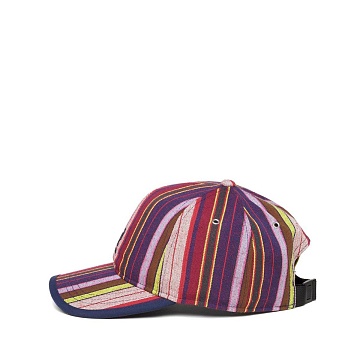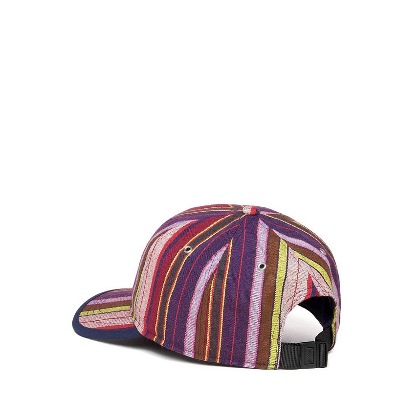 Бейсболка с вертикальными полосами. Особенность бейсболки, помимо насыщенной полосатости — регулятор быстрой утяжки. Яркие полосы, навеяны модой 70х и оттенками преппи культуры. Модерновый логотип из силикона на передней части бейсболки.